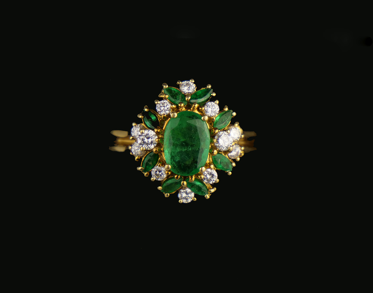 mimořádný zlatý prsten se smaragdy a brilianty o celkové hmotnosti cca 2.90 ct, centrální smaragd oválného kombinovaného brusu má hmotnost cca 1,7 ct, dobré kvality, transparentní, dále na prstenu 8ks smaragdů v brusu Markýza o hmotnosti cca 0,8 ct, 12 ks diamantů briliantového brusu o hmotnosti cca 0,4 ct, barva G-H, SI, Au 5,67 g/750/1000, Západní Evropa, kolem r. 1960, velikost prstenu 55